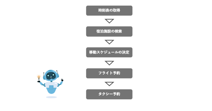 加えて、「搭乗するフライトを決定してから、到着時刻にタクシーが空港で待機しているように、タクシーを予約時間を決定する」と、AIエージェントはそれぞれのタスクの実行順を考えタスクを組み立てることができます。