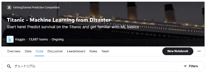 Kaggleには、「タイタニックコンペ」という練習用のコンペがあります。 Active Competitionsの右下にある「Titanic - Machine Learning from Disaster」を選択してみましょう。