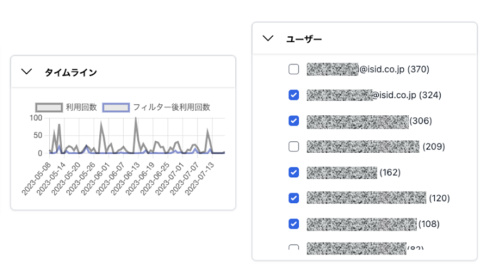 タイムラインとユーザーから利用者の利用履歴を絞り込むことができます。