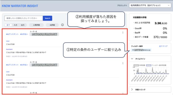 この記事では、ChatGPT導入担当者や情報システム部門の方に向けて、対話ログ分析ソリューション Know Narrator Insightを活用した、社内用ChatGPT導入後の利用実態や導入効果の分析手法について紹介したいと思います。