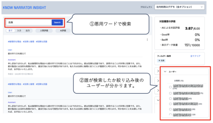 文章検索で「危険」や「倫理」と入力すると、対話履歴に含まれる単語から悪用が疑われる対話をフィルタリングします。その後ユーザーの欄から利用者を特定することができます。