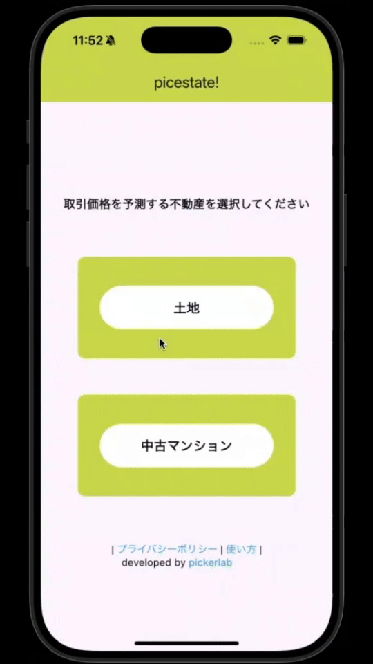 画面上で中古マンションの諸情報を入力するだけで、AIが推測した取引価格を表示できるシンプルなアプリです。事前に、30万件の取引データを学習させたAIモデルを構築し、そのモデルをAndroidアプリ、iOSアプリで運用しています。