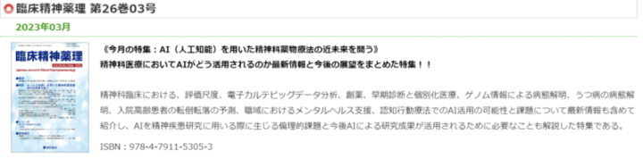 論文「精神科領域におけるAI技術を活用した評価尺度」が臨床精神薬理にて特集として掲載されました