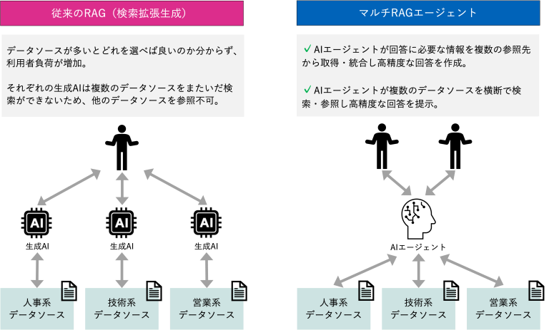 しかし、最新の動向として、こうした課題を解決できる手段が登場しました。それがマルチRAGエージェントです。